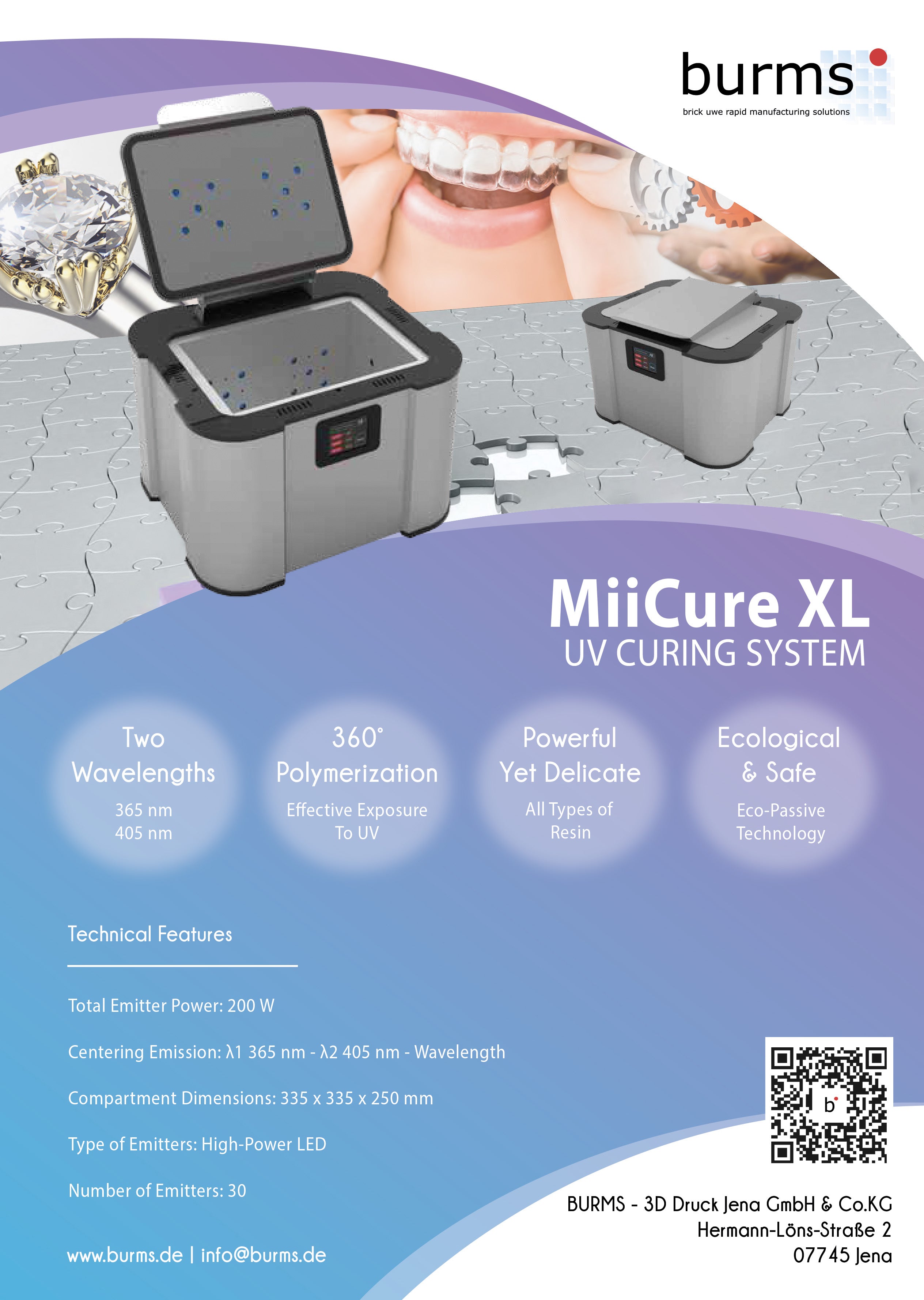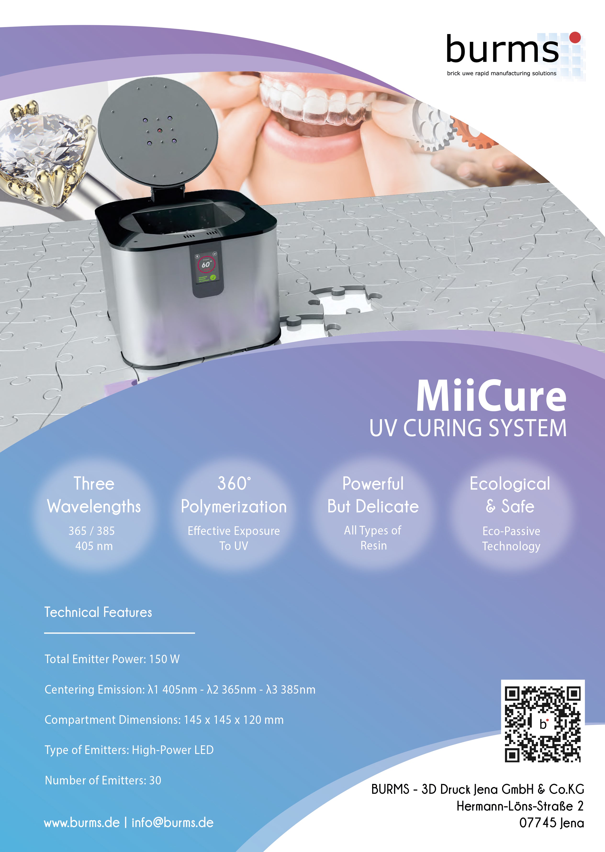 MiiCure is a compact polymerizer with incredible performance thanks to its two wavelengths that irradiate the resins on all six sides. Once you've selected the right UV power and temperature, all you have to do is admire the results.
