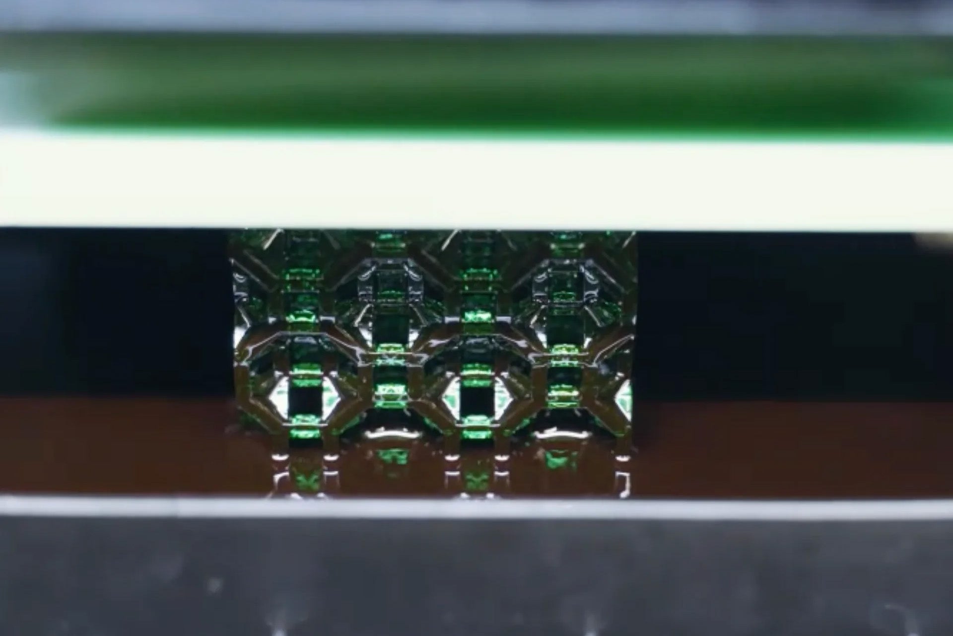 Dadurch entsteht eine Schicht des Bauteils. Die Bauplattform fährt ein wenig hoch und erzeugt damit wieder einen definierten Abstand zwischen Wannenboden und der neulich produzierten Schicht. In einem iterativen Prozess wird so Schicht für Schicht ein Bauteil mit höchstem Detailgrad durch die UV-Projektoren produziert.