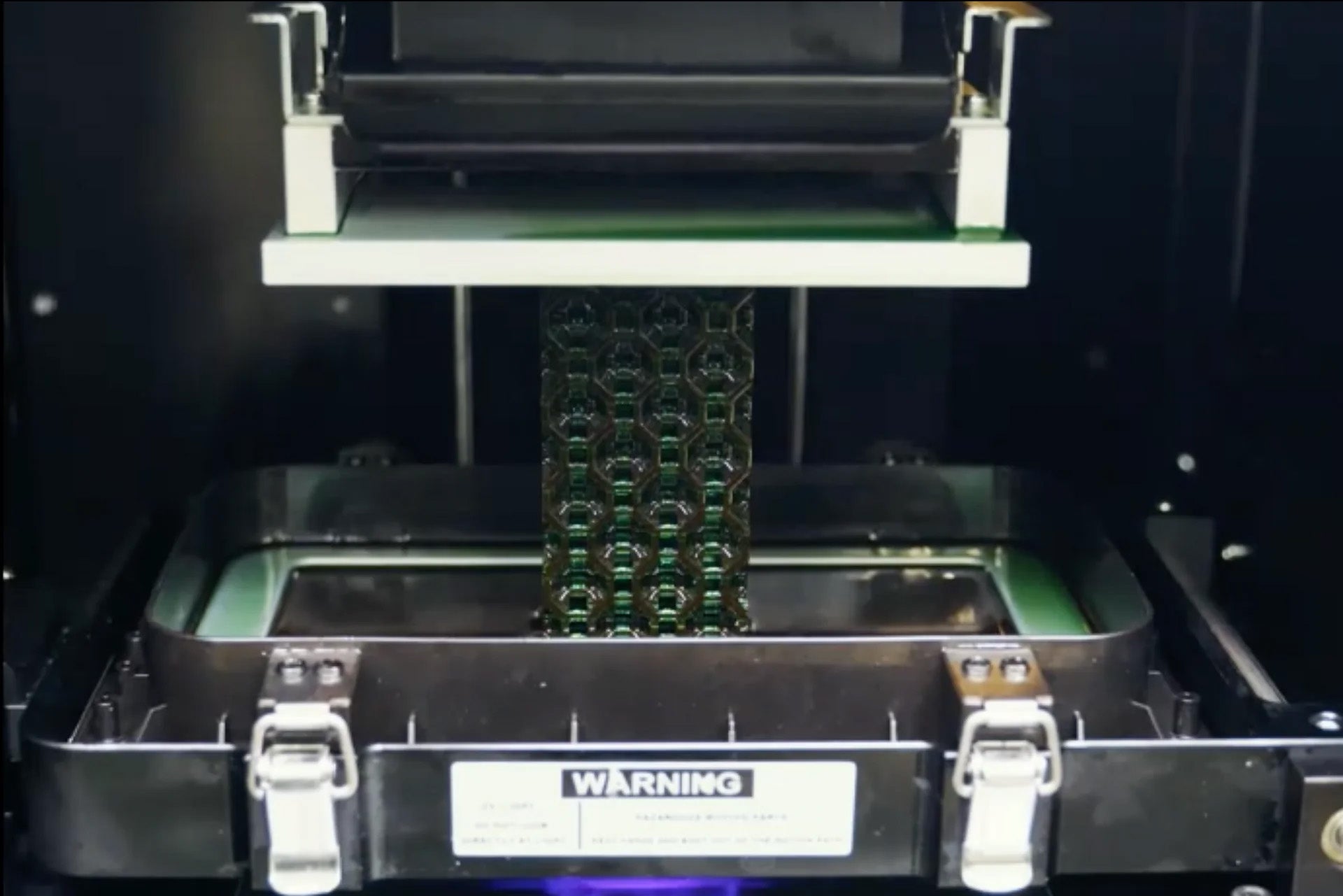 Nachdem der Picker in die Harzwanne abgesenkt wurde, wird mittels eines industriellen UV-Projektors ein Querschnitt des zu bauenden Bauteils durch den transparenten Wannenboden hindurch auf das Harz projziert. Das UV-Licht-Bild führt dem Harz Energie zu, wodurch das Harz an den Stellen, wo Licht auftrifft, aushärtet.